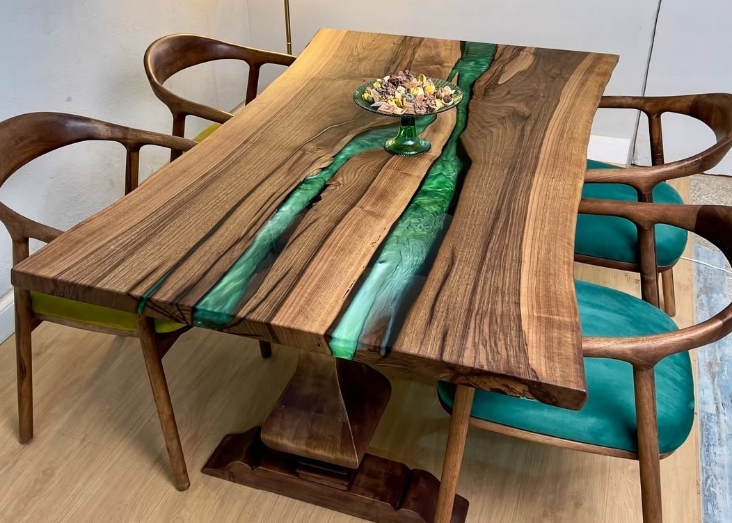 Com um rio de resina verde translúcida que percorre a madeira como se a própria floresta fluísse por ela, cada peça é única, marcada pelo contraste entre o orgânico e o moderno.
