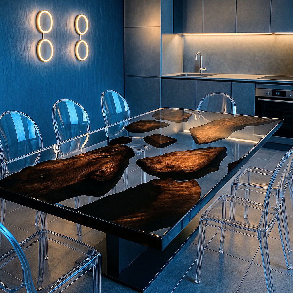 Com blocos de madeira natural imersos em resina transparente, ela transforma qualquer ambiente em uma verdadeira galeria de design contemporâneo.
