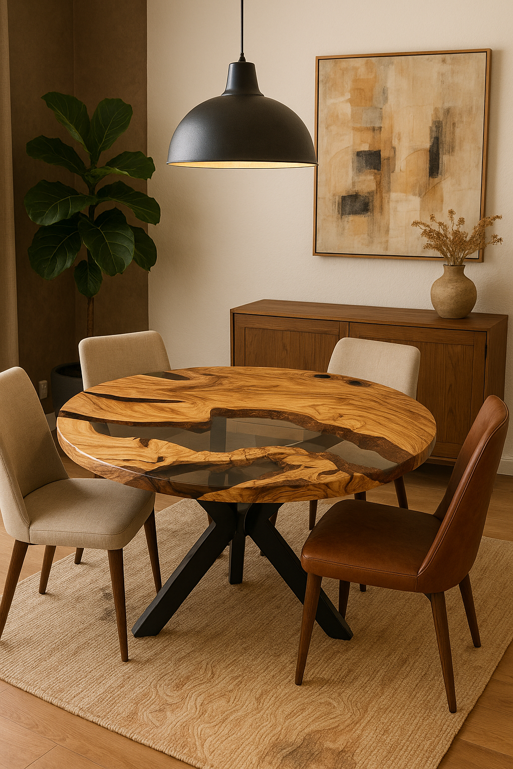 Transforme seu ambiente com a sofisticação natural da The Driftwood River, uma mesa de jantar única que combina o charme orgânico da madeira maciça com a fluidez moderna da resina translúcida.